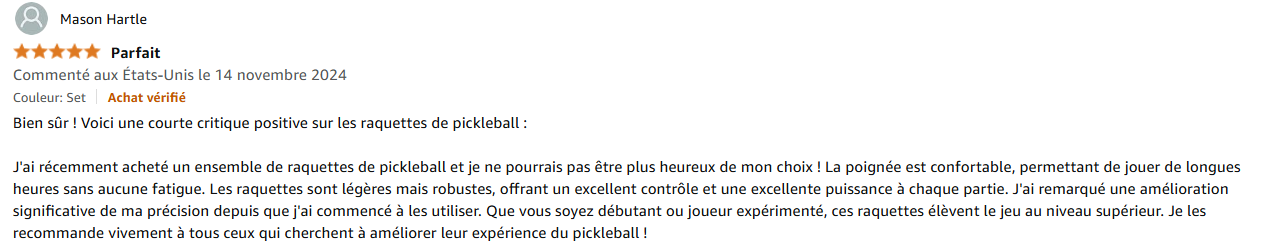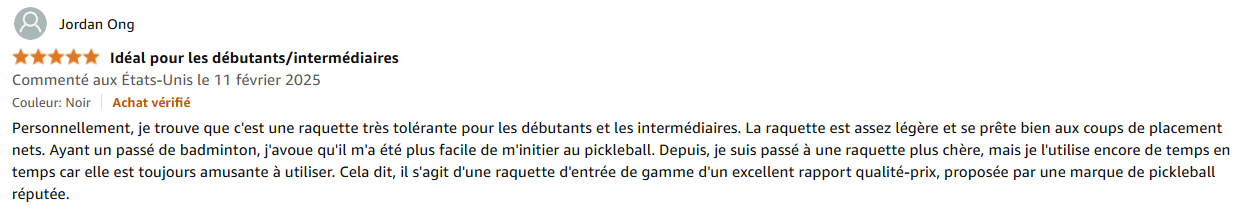Ce qui m’a vraiment séduite, c’est la facilité avec laquelle j’ai pu maîtriser cette raquette. Son noyau en polymère en nid d’abeille et sa surface en fibre de verre offrent un excellent contrôle, idéal pour apprendre les bases du pickleball. Le large « sweet spot » m’a permis de frapper la balle correctement, même quand je ne la touchais pas parfaitement au centre. Une vraie aubaine pour gagner en confiance !
